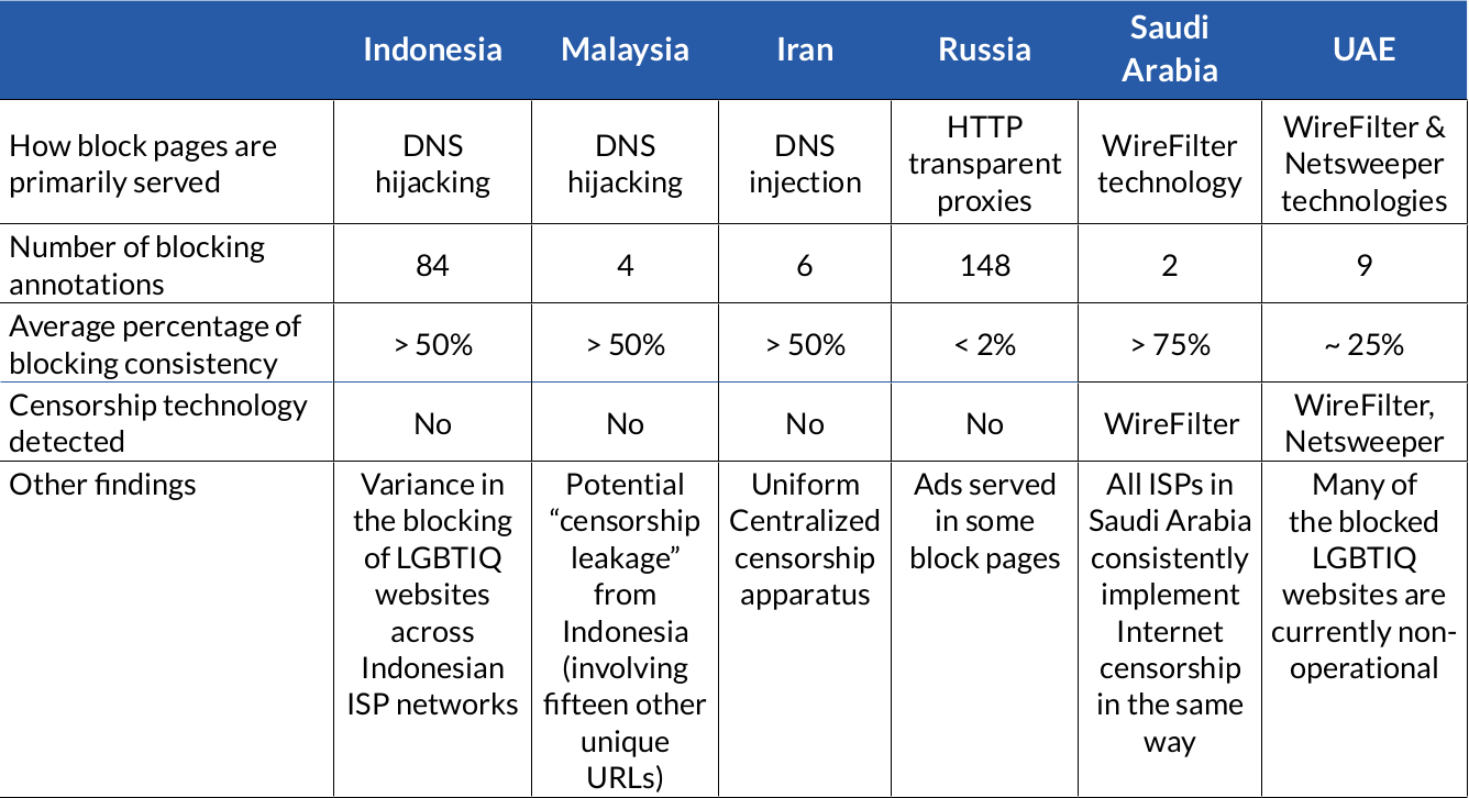 We joined forces with OutRight Action International and the Citizen Lab to examine the blocking of LGBTIQ websites in six countries: Indonesia, Malaysia, Iran, Russia, Saudi Arabia, and the United Arab Emirates (UAE). We selected these countries because they are (a) known to serve block pages (i.e., pages that website visitors may see when access is restricted), which enable us to automatically confirm the blocking of LGBTIQ websites, and (b) known to censor LGBTIQ related content, based on prior research.