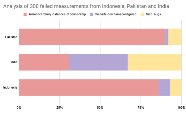Overall, for India, 31 out of the 100 measurements classified as ‘failures’ were indicative of network interference/censorship.
